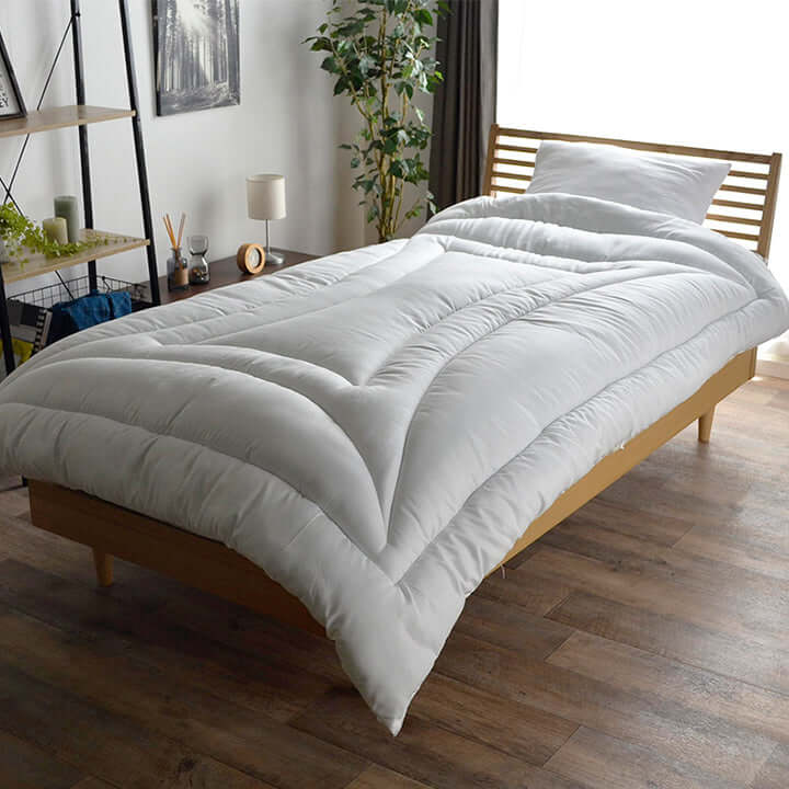 掛布団、敷布団、枕の3点セット 高品質な快眠体験をお求めの方におすすめです。 掛布団は、体にぴったりフィットする「フィットキルト加工」が施されており、隙間ができず熱を逃がしにくい特長があります。 中材には「フィルハーモニー」を使用しており、吸汗・速乾性、抗菌防臭性、防ダニ性、ノンダスト/かさ高性の4つの優れた特性が備わっています。 常に清潔で快適な睡眠をお楽しみいただけます。
